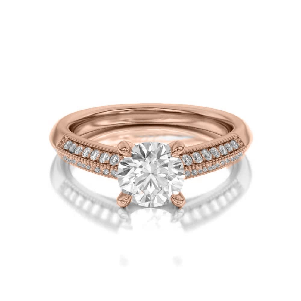 This women's engagement ring features a round brilliant natural diamond at the centre, which is kept firmly in place by a sturdy four prong setting. The shanks are delicately accented by two half stone lines, and the texture's grooved appearance adds even more style. The bridge is exquisitely made in an antique style. It is ideal for people who value traditional and beautiful designs with a contemporary touch. All Temple and Grace jewellery is beautifully crafted to the highest standards and is made at our jewellery workshop directly by us (skilled jewellery craftsmen). This is why you can save over 40% when compared to high-street retail prices. We also offer a lifetime warranty and unmatched 100 day returns. You can shop online or book an appointment to visit our jewellery boutiques in Sydney, Melbourne, Brisbane and Perth.