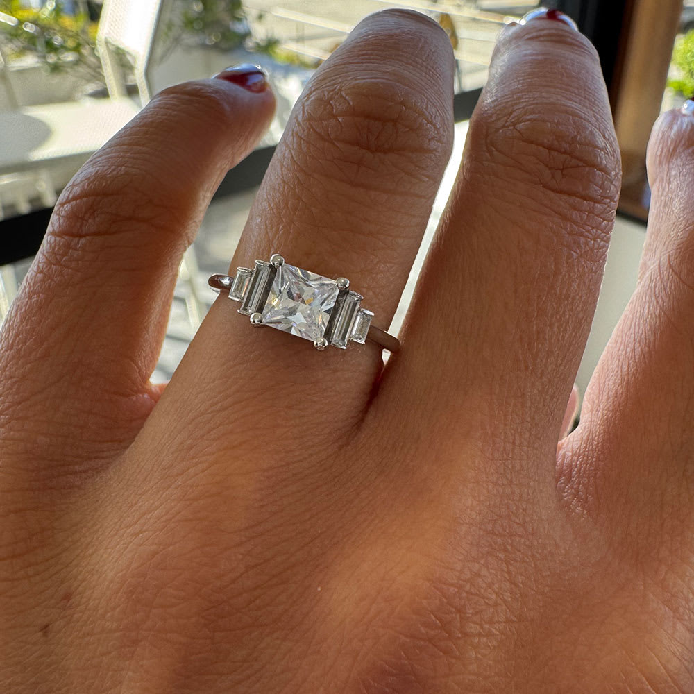 This women's engagement ring features a breathtaking princess cut diamond at it's focal point, exuding a modern and elegant charm. Flanking the focal diamond on each side are baguette cut side stones, adding a touch of sophistication and refinement to it. The polished, round shanks add a touch of comfort and practicality, making it a symbol of enduring love and beauty that will be cherished for a lifetime. All Temple and Grace jewellery is beautifully crafted to the highest standards and is made at our jewellery workshop directly by us (skilled jewellery craftsmen). This is why you can save over 40% when compared to high-street retail prices. We also offer a lifetime warranty and unmatched 100 day returns. You can shop online or book an appointment to visit our jewellery boutiques in Sydney, Melbourne, Brisbane, Perth and Adelaide.