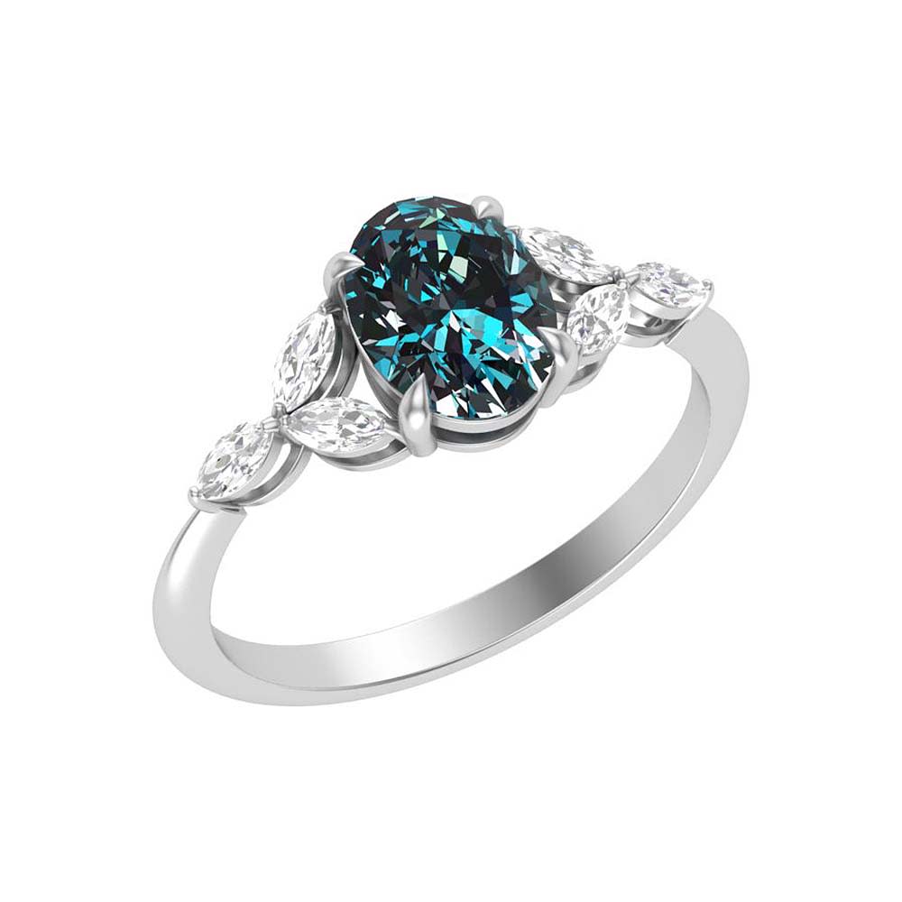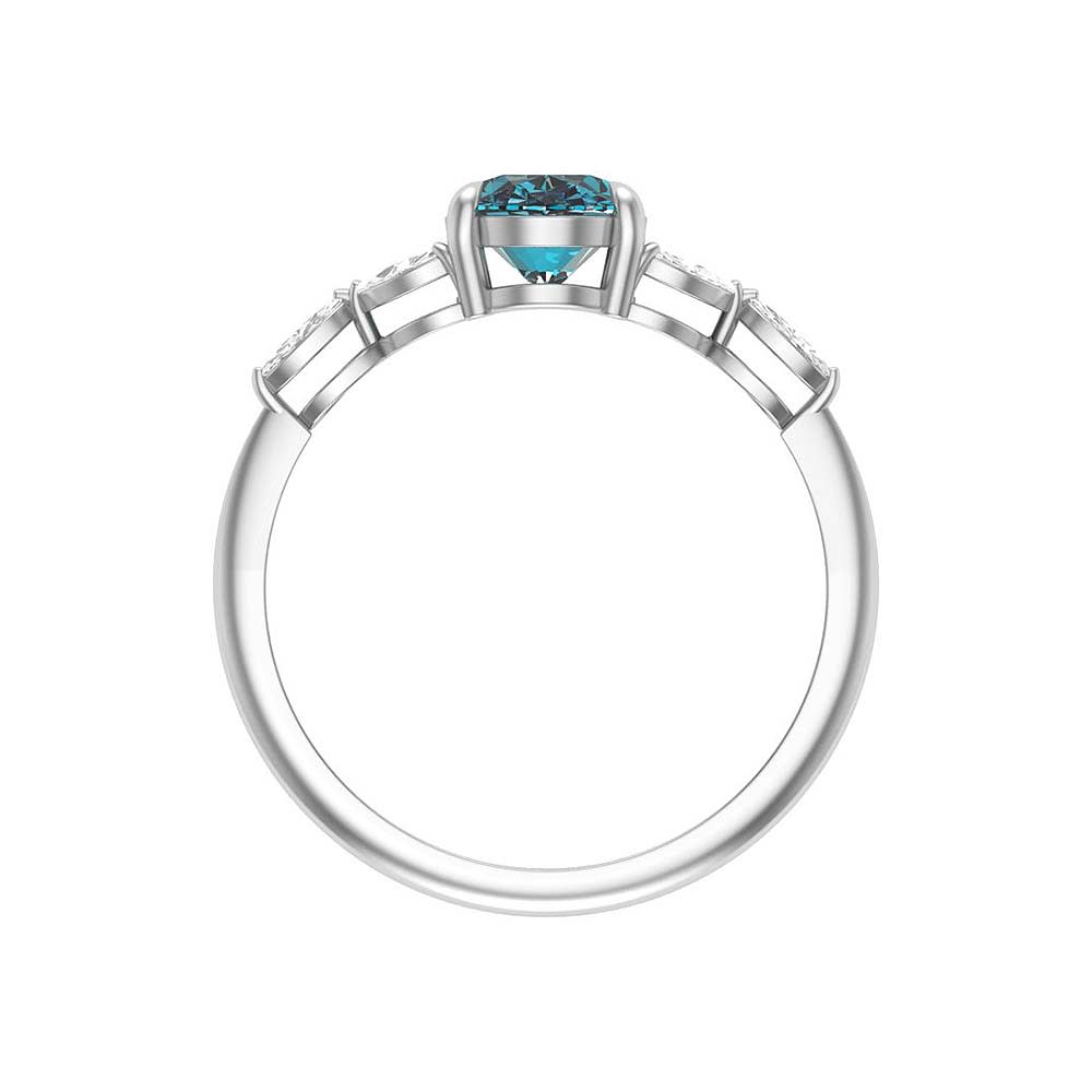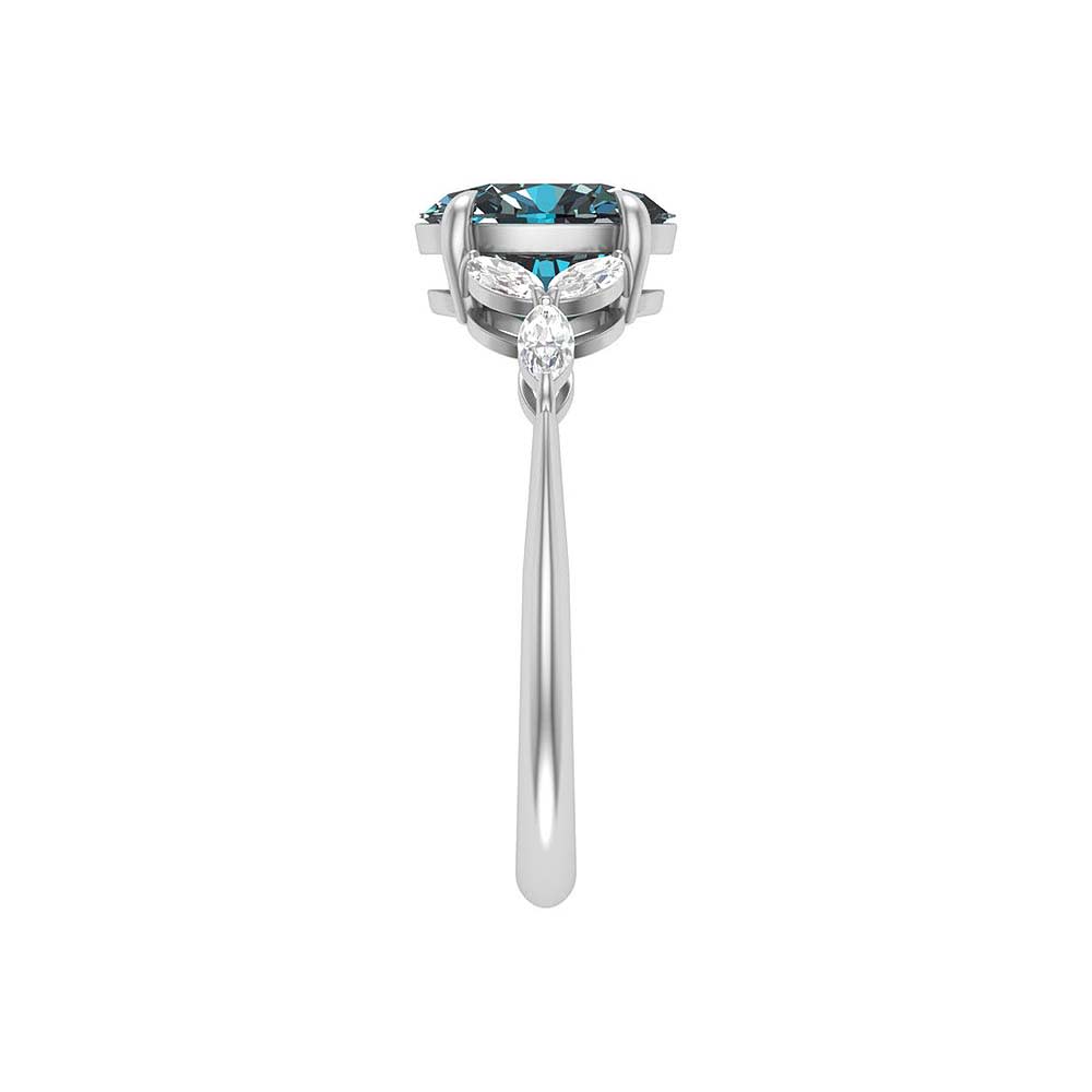 The elegance of a sophisticated ring. Set with a Teal Natural sapphire and enhancing the saphhire with natural marquise cut diamonds. The beauty of this ring exceeds other designs. A romantic ring for an engagement or as a forever ring. The workmanship is made to the finest detail. This enhances the design more. Available in. rose, white and yellow gold. Ask your professional sales advisor for any assistance.