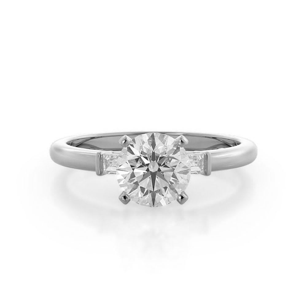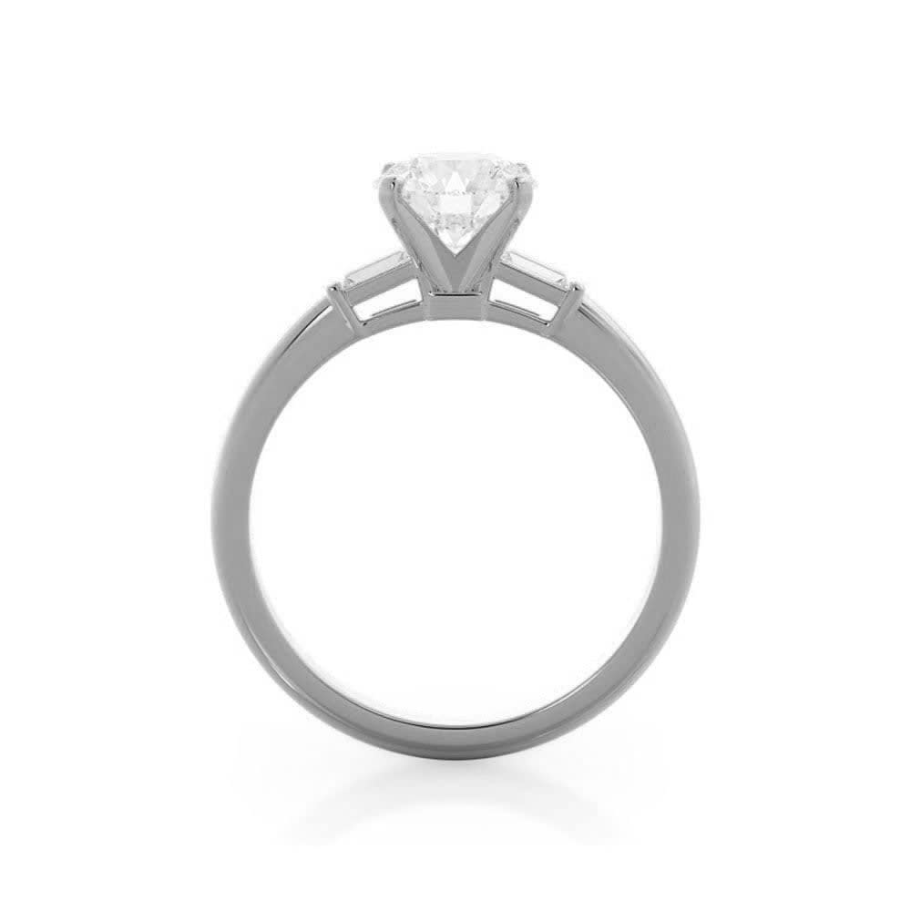 This women's diamond engagement ring with a round brilliant natural diamond in the centre and baguette diamonds on both sides gives a beautiful and elegant look. It is set in a prong setting, which allows light to enter the diamond from all angles, enhancing its beauty. It has polished and rounded edge, creating a sleek and comfortable design. All Temple and Grace jewellery is beautifully crafted to the highest standards and is made at our jewellery workshop directly by us (skilled jewellery craftsmen). This is why you can save over 40% when compared to high-street retail prices. We also offer a lifetime warranty and unmatched 100 day returns. You can shop online or book an appointment to visit our jewellery boutiques in Sydney, Melbourne, Brisbane and Perth.