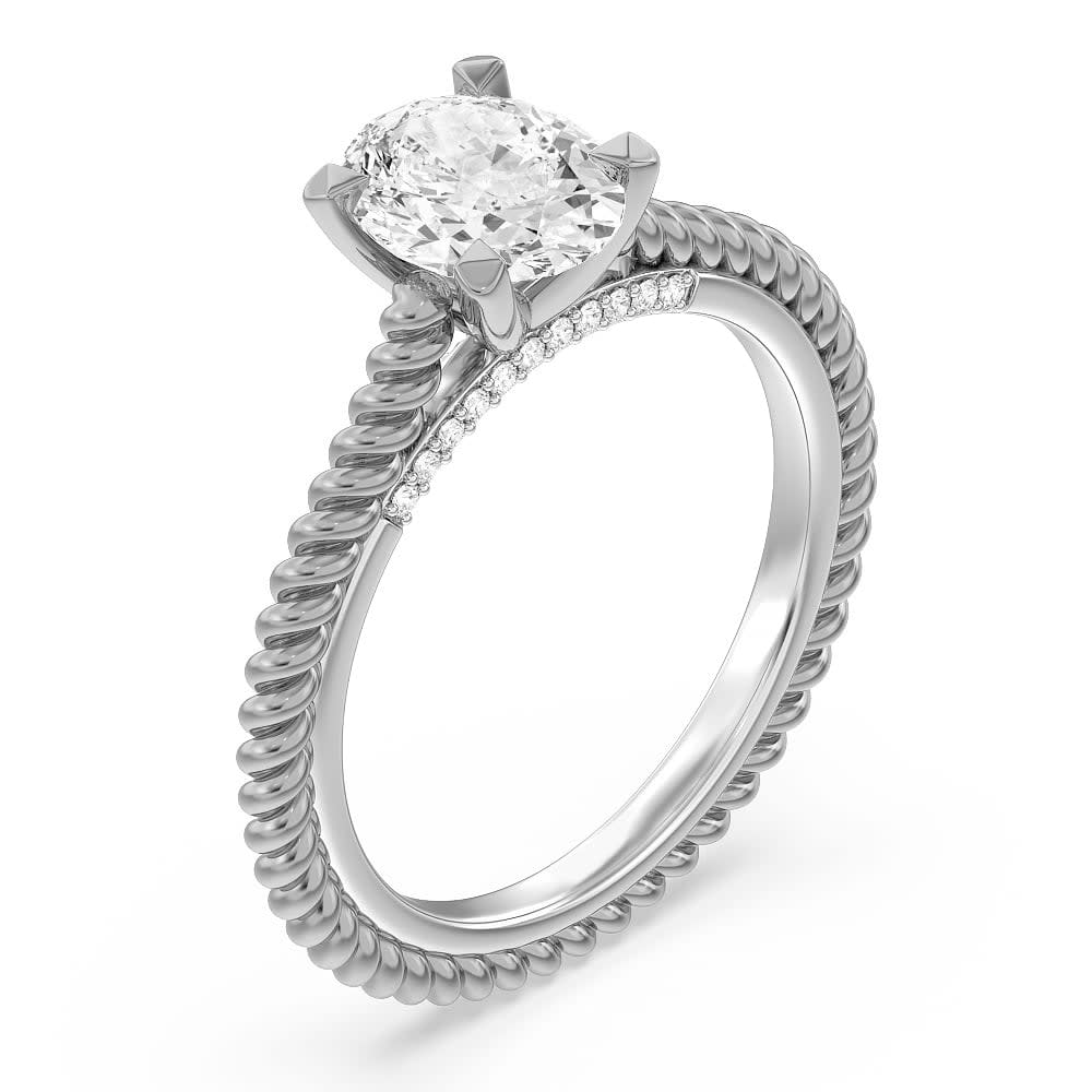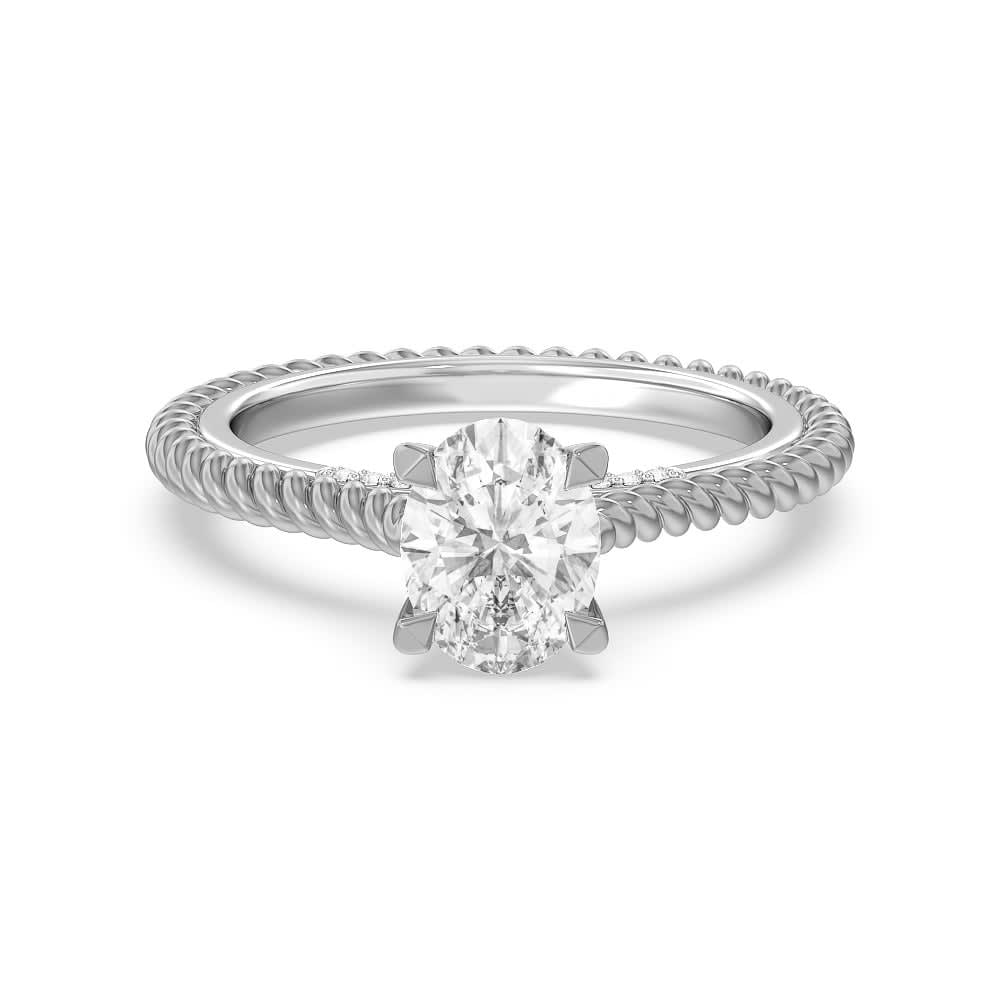 This woman's engagement ring features lab grown an oval shaped diamond at the centre. The inner band is lovely and has a round stones set in a four prong setting. The ring's shanks are composed of twisted rope to emphasize it's attractiveness. It has a twist which gives it a textured finish, and the gold gives it a sophisticated, vintage feel. All Temple and Grace jewellery is beautifully crafted to the highest standards and is made at our jewellery workshop directly by us (skilled jewellery craftsmen). This is why you can save over 40% when compared to high-street retail prices. We also offer a lifetime warranty and unmatched 100 day returns. You can shop online or book an appointment to visit our jewellery boutiques in Sydney, Melbourne, Brisbane and Perth.