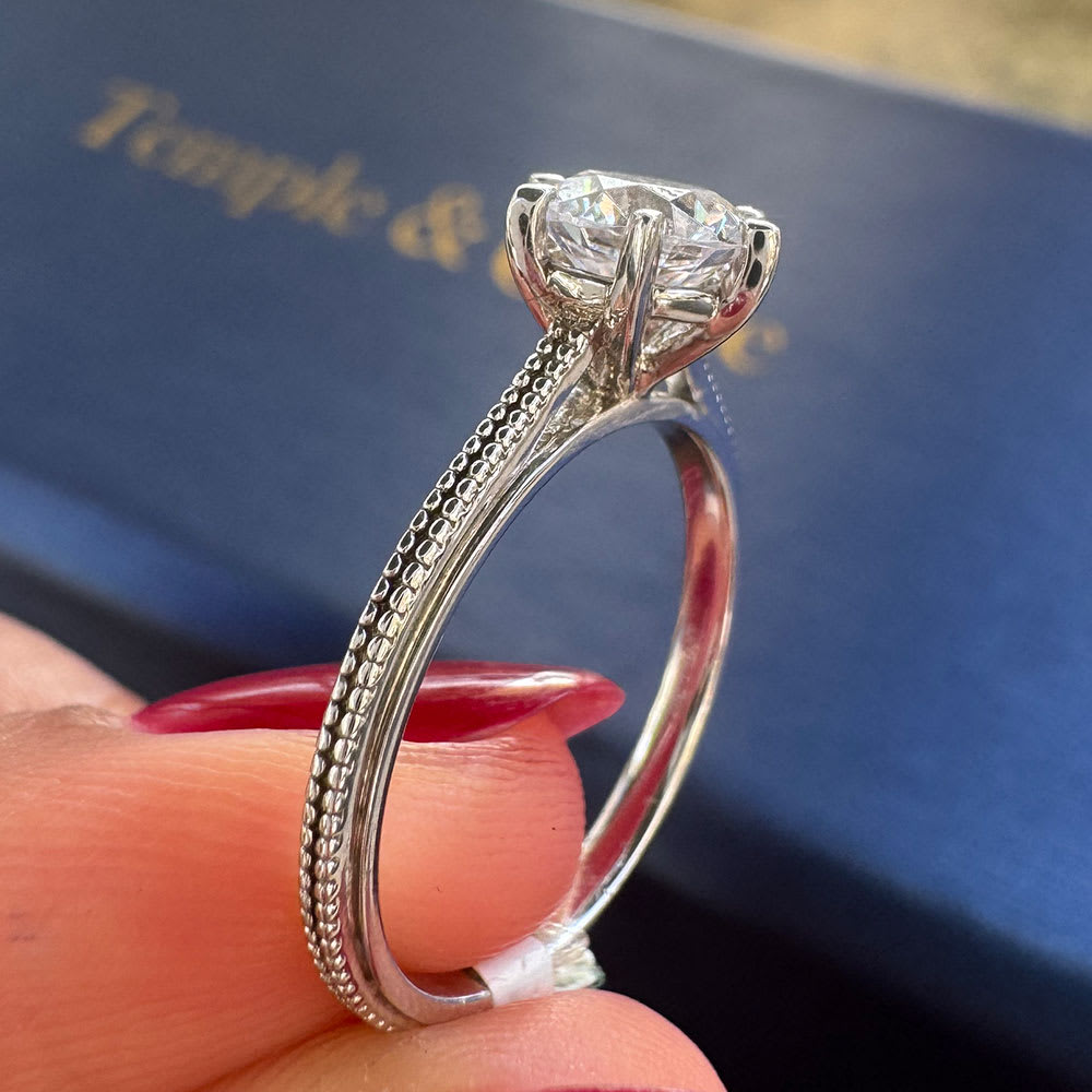 This women's engagement ring features a brilliant round cut natural diamond in a six prong setting. The centre stone is expertly cut and polished, with maximum brilliance and fire. It's cathedral shoulders feature a beautiful grooved line running through them and highlighting the focal stone and adding to its grandeur. All Temple and Grace jewellery is beautifully crafted to the highest standards and is made at our jewellery workshop directly by us (skilled jewellery craftsmen). This is why you can save over 40% when compared to high-street retail prices. We also offer a lifetime warranty and unmatched 100 day returns. You can shop online or book an appointment to visit our jewellery boutiques in Sydney, Melbourne, Brisbane and Perth.