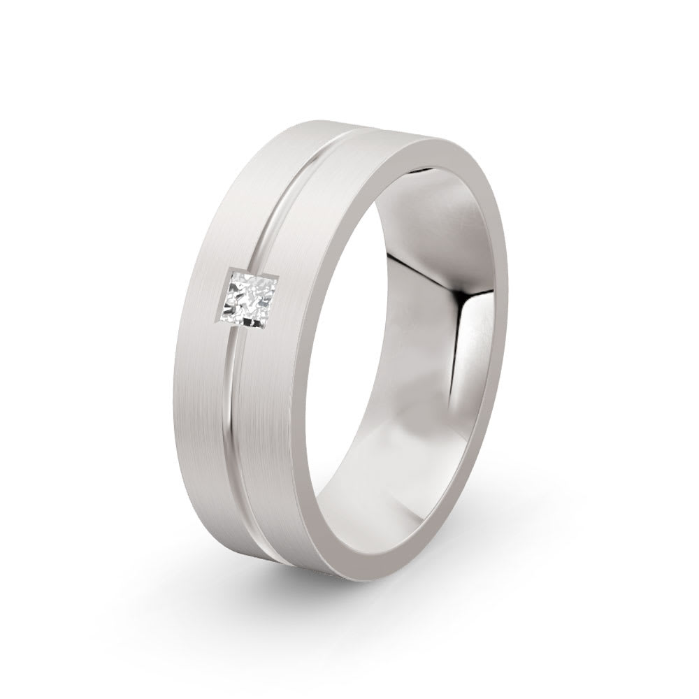 A stunning men's wedding band featuring a single princess cut diamond set within a fine groove. The brushed finish adds a modern touch to its timeless design. Crafted for those who appreciate subtle elegance and clean lines. All Temple and Grace jewellery is beautifully crafted to the highest standards and is made at our jewellery workshop directly by us (jewellery craftsmen). This is why you can save over 40% when compared to high-street retail prices. We also offer a lifetime guarantee and unmatched 100 day returns. You can shop online or visit our jewellery stores in Sydney, Melbourne, Brisbane, Perth and Adelaide or book an appointment to visit our jewellery boutiques.